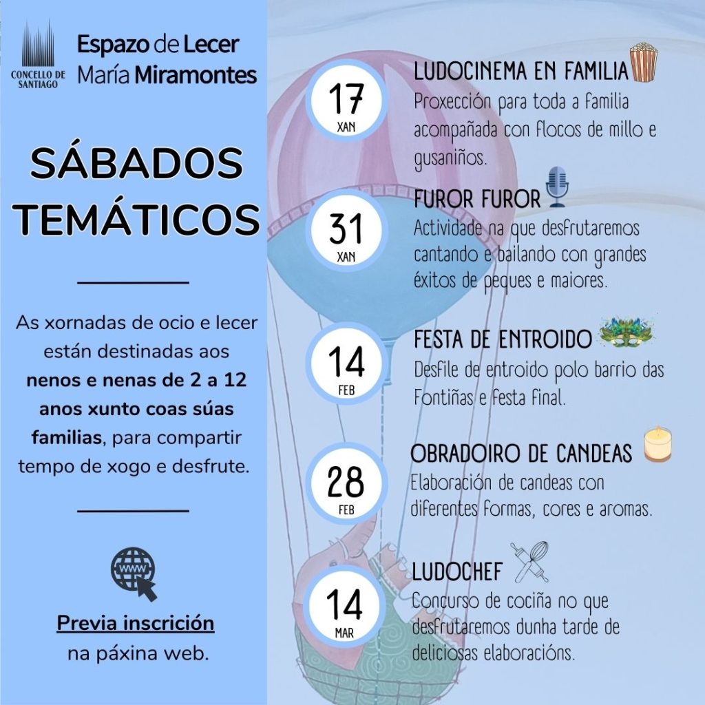 A inscrición para os sábados temáticos abre sempre o luns previo á data de celebración ás 16:00h.