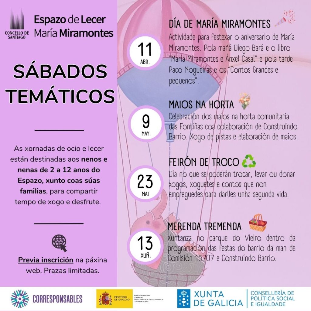 Os sábados, o Espazo de Lecer María Miramontes abrirá as súas portas aos nenos e nenas da cidade de Santiago de Compostela con idades comprendidas entre os 2 e os 12 anos de idade, acompañados das súas familias.